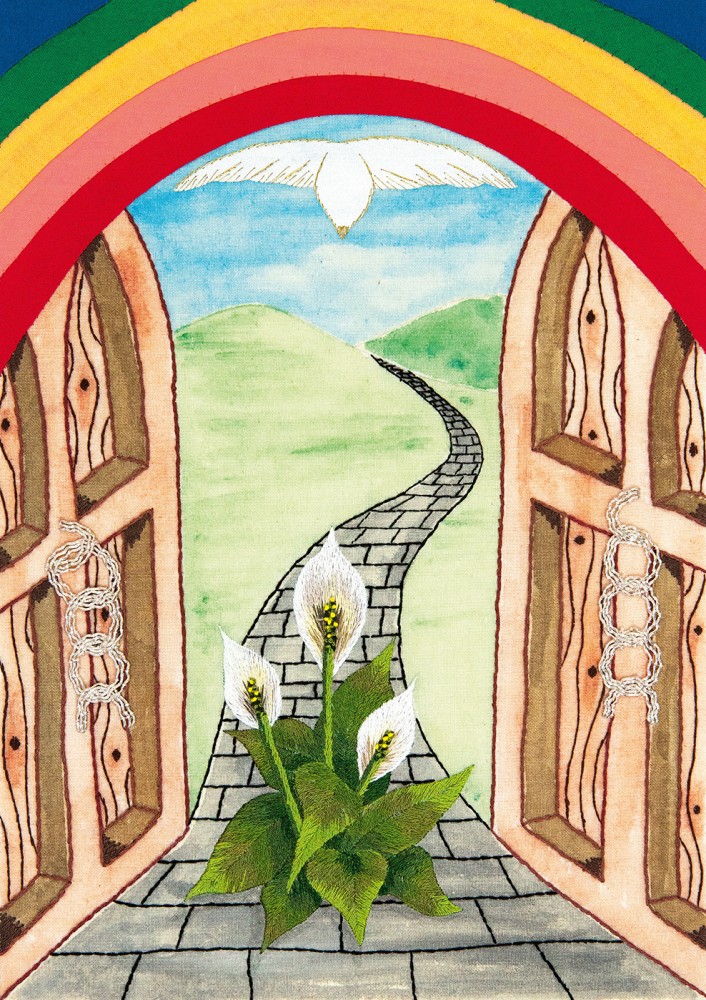 Das Titelbild zum Weltgebetstag 2022 stammt von der britischen Künstlerin Angie Fox und ist eine Stickerei. In ihrem Bild mit dem Titel „I know the plans I have for you“ vereint die Künstlerin verschiedene Symbole für Freiheit, Gerechtigkeit und Gottes Friede und Vergebung.