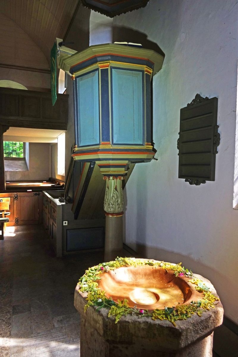 Entdeckungen auf dem Pilgerweg: Kanzel und Taufstein in der evangelisch-reformierten Kirche Stapelage. Foto: Robin Jähne