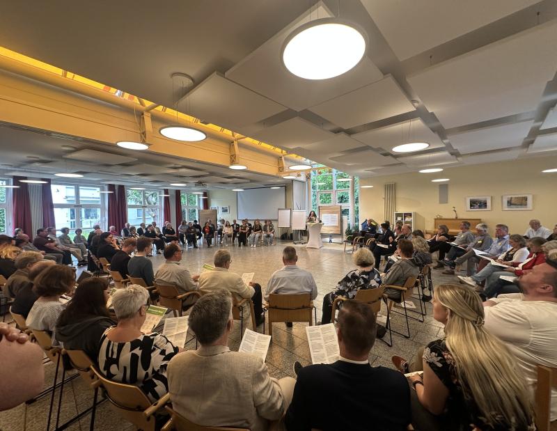 Ein großer Raum im Gemeindezentrum St. Pauli in Lemgo. Viele Leute sitzen in einem großen Stuhlkreis. Eine junge Frau steht und spricht.