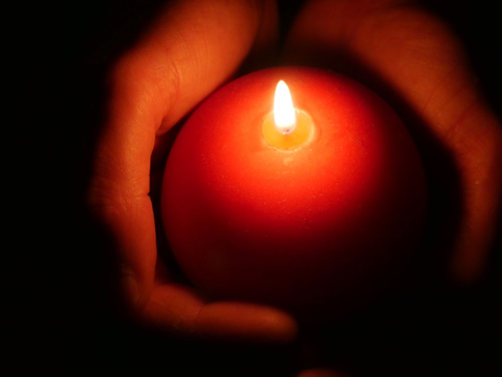 Zwei Hände halten eine runde leuchtende rote Kerze