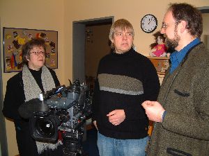 WDR-Reporterin Bärbel Wegener und Kameramann Bernd Roßocha im Gespräch mit Pfarrer Horst-Dieter Mellies (von links).