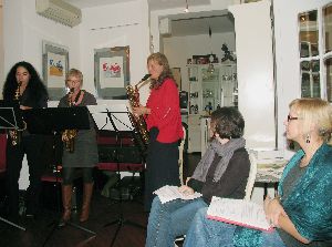Trommer und Prekodravac gestalteten ihren Vortrag interaktiv, so dass interessierte Zuhörerinnen im Laufe des Abends miteinander ins Gespräch kamen und lebhaft diskutierten. Renate Sielemann (Altsaxophon), Ulrike Wedeking (Baritonsaxophon) und Tatjana Arndt (Altsaxophon) begleiteten die Veranstaltung musikalisch.