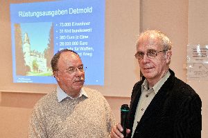 Paul Russmann (rechts) erläuterte auf der von Pfarrer Christian Brehme (links) moderierten Friedenstage-Veranstaltung, dass anhand der Zahlen des Bundeshaushalts und umgerechnet auf die 73.000 Einwohner Detmolds die „Detmolder Rüstungsausgaben“ jährlich 28 Millionen Euro ausmachten.