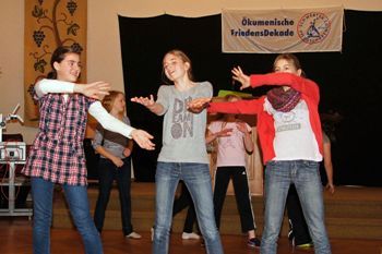 Viel Beifall gab es für die Mädchen, die unter der Anleitung von Mareen Schwartmann, Mitglied der Tanzgruppe „Bailandos“ des Sportvereins TuS Eichholz-Remmighausen, einen Tanz zu „Gebt alles“ der deutschen Pop-Sängerin Cassandra Steen erarbeiteten. Die Choreographie entwickelte sich aus einer anfänglichen Streitszene über ein Durch- und Gegeneinander hin zu einem Miteinander. Schließlich warfen die Mädchen allerlei Bonbons und Süßigkeiten ihrem hoch erfreuten Publikum zu - und bewiesen damit ganz anschaulich, wie ein eigennütziges und streitsüchtiges „Gier Macht Krieg“ überwunden wird durch ein freundliches und einnehmendes „Gebt alles“.
