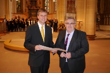 Ernennung zum Kirchenmusikdirektor: Kantor Friedemann Engelbert (links) erhielt in St. Nicolai in Lemgo die Urkunde zur Ernennung durch Kirchenrat Tobias Treseler.
