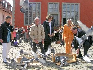 Das Aufbruchsignal zum Ökumenischen Kirchentag in genau einem Jahr war in Gestalt des Taubenschwarms nicht nur zu sehen, sondern in der Lemgoer Innenstadt auch zu hören. Zuerst spielten die Bläser des Posaunenchors Lemgo unter der Leitung von Uwe Müller. Dann setzte sich St. Nicolai-Kantor Friedemann Engelbert an den Spieltisch der Kirchenglocken und ließ aus dem Nordturm (mit der runden Haube) hoch über dem „Steinernen Saal“ die Melodie „Komm, Herr, segne uns“ erklingen, in die die Marktplatzbesucher einstimmten.