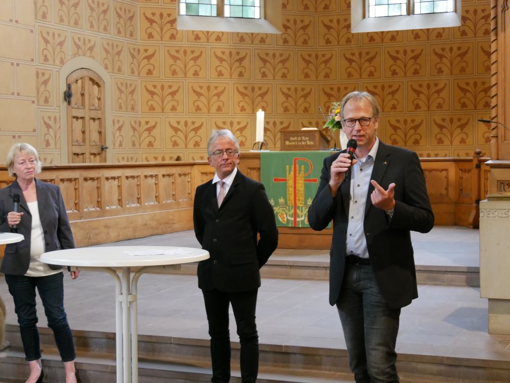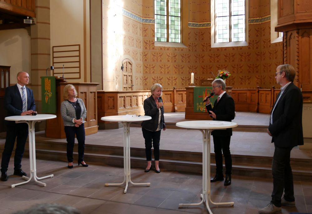 Die Gäste erhielten in einem von Bildungsreferentin Monika Korbach moderierten Talk Eindrücke aus verschiedenen Arbeitsbereichen im Bereich der Lippischen Landeskirche während der Pandemie, die für alle mit Einschränkungen, aber auch mit neuen Erkenntnissen verbunden waren. So musste der komplette Alltag in der Stiftung Eben-Ezer zügig zu Beginn der Epidemie umgestellt werden, Werkstätten und Gemeinschaftseinrichtungen geschlossen und die Menschen „rund um die Uhr in ihren Wohnheimen“ betreut werden, berichtete Dr. Bartolt Haase, Theologischer Vorstand der Stiftung Eben-Ezer. Kirchengemeinden änderten ihre Gottesdienstangebote von Präsenz auf digitale Formate und hielten die Kirchen für Besucher offen, erläuterte Superintendent Andreas Gronemeier, Pfarrer der ev.-ref. Kirchengemeinde Schötmar. Von den besonderen Herausforderungen von Kirchen des globalen Südens, die sich über Kollekten aus Gottesdiensten, die nicht mehr stattfinden konnten, finanzieren, wusste Dieter Bökemeier, Landespfarrer für Diakonie, Ökumene und Migration zu berichten. Pfarrerin Susanne Eerenstein, Leiterin des Evangelischen Beratungszentrum, schilderte die Erweiterung des Angebots der Beratung, die bisher ausschließlich in der persönlichen Begegnung stattfand, um Telefon- und Videoberatung. Dies wolle man auch so beibehalten. Das Zusammenkommen per Videokonferenz mit den Partnern in der weltweiten Ökumene bewertete auch Dieter Bökemeier als hilfreich. „Zur Verfügung stehen auch unter schwierigen Bedingungen“ sei ein Kennzeichen von Kirche, meinte Susanne Eerenstein. Deutlich wurde, dass in all dem Schlimmen der Pandemie diese Zeit auch eine des „gemeinsamen Lernens und des Aneignens neuer Fähigkeiten ist“, wie Dechant Norbert Nacke die mit viel Applaus bedachten Eindrücke und Informationen aus kirchlichen Arbeitsfeldern zusammenfasste.