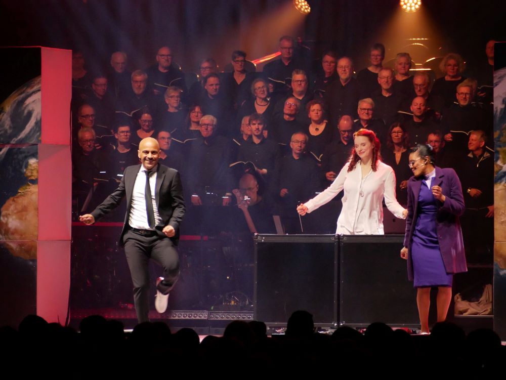 Im Zentrum stand der Mega-Chor, der für Gänsehautmomente sorgte und die Gäste mit seiner Energie verzauberte. Unter Leitung von Peter Stolle, der die Choristen bestens vorbereitet hatte, wirkten alle Sänger punktgenau und in bester Textverständlichkeit. Altbekannte Gospels und Protestsong wie „Go Down Moses“ erhielten in großer Singfreude aktuelle Bezüge im neuen Sound. Die Choristen meisterten in ihren 22 Songs auch choreografische Elemente im Gospelschritt und sorgten für optische Effekte wie Wellenbewegungen. Die Instrumentalisten unter der Leitung von Christoph Terbuyken, der E-Bass spielte, verliehen der Musik viel Drive.