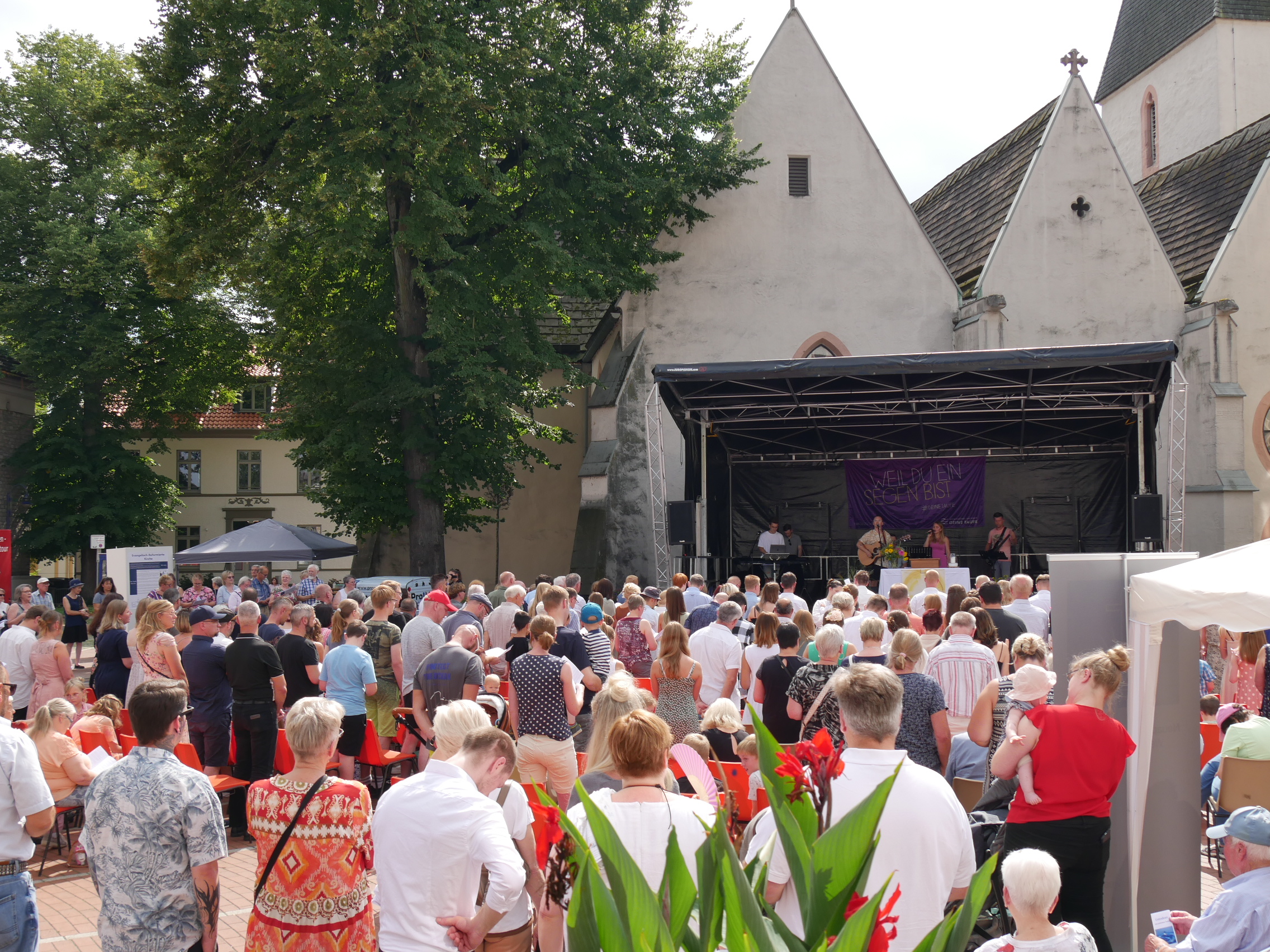 Alle hatten mit organisiert und mitangepackt im Vorfeld, alle steuerten Informationen über ihre Gemeinden bei zum Fest und im Gottesdienst gab es viel Musik vom Posaunenchor der Evangelisch-lutherischen Kirchengemeinde, dem Lobpreischor der E.L.I.A. Gemeinde sowie dem Kinderchor und der Kantorei der Evangelisch-reformierten Kirchengemeinde. Pfarrer Richard Krause von der lutherischen Gemeinde brachte in seiner Predigt den Besucherinnen und Besuchern und vor allem den Kindern mit dem Kuscheltier „Wildfang“ nahe, was Gott ihnen in ihrem Leben bedeuten kann. Denn so wie das Kuscheltier Wildfang immer da ist – zum Kuscheln, zum Erzählen, zum Zuhören und auch zum Vollweinen oder Schimpfen – so ist auch Gott immer da: „Gott hört immer zu“.