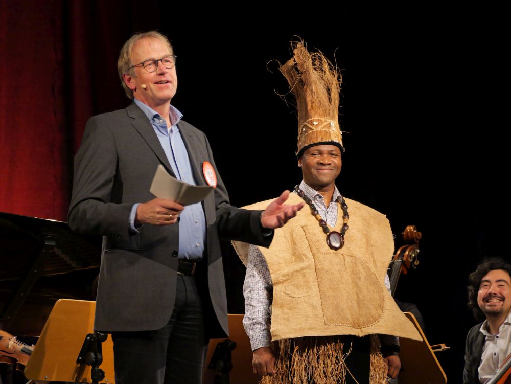 Im zweiten Teil erklangen Hits verschiedener Länder, vom Salonorchester im besten Zusammenspiel begleitet. Akoas klassischer Anzug wechselte mit einem königlichen Gewand aus Kamerun. Neben Schlagern wie „Griechischer Wein“ von Udo Jürgens beeindruckte das chinesische Lied „Mo li hua“ (Jasmin-Blume). „Besame mucho“ des mexikanischen Komponisten Consuelo Velázquez erhielt Bravorufe und die Hommage des Italieners Lucio Dalla an den legendären Tenor Caruso bestach mit schwelgenden Kantilenen. Neben französischen Chansons erklangen auch Lieder aus Kamerun im ansprechenden Arrangement wie „Sikati“ (Gott schläft nie ein). In einem faszinierenden Solo für Stimme, Bambusflöte und Sanza, dem afrikanischen Daumenklavier, zeigte der Berliner Venant Ntiomo, wie Musik als Kommunikationsmittel wirkt, indem er den ganzen Saal mit einer Hymne auf die Liebe zum Mitsingen brachte. Rhythmisch prägnant begleitete er auf der Trommel „Etong Ntomba“, das große Finale aus Kamerun, das mit allen Musikern einen beeindruckenden Ausklang schuf. Das Konzert machte auf die Anliegen von Brot für die Welt aufmerksam, über dessen Arbeit sich die Gäste in der Pause bei einem Getränk informieren konnten. Zudem kamen über 1200 Euro an Spenden für das Hilfswerk zusammen. Weitere Spenden sind wie immer hoch willkommen (siehe www.brot-fuer-die-welt.de)