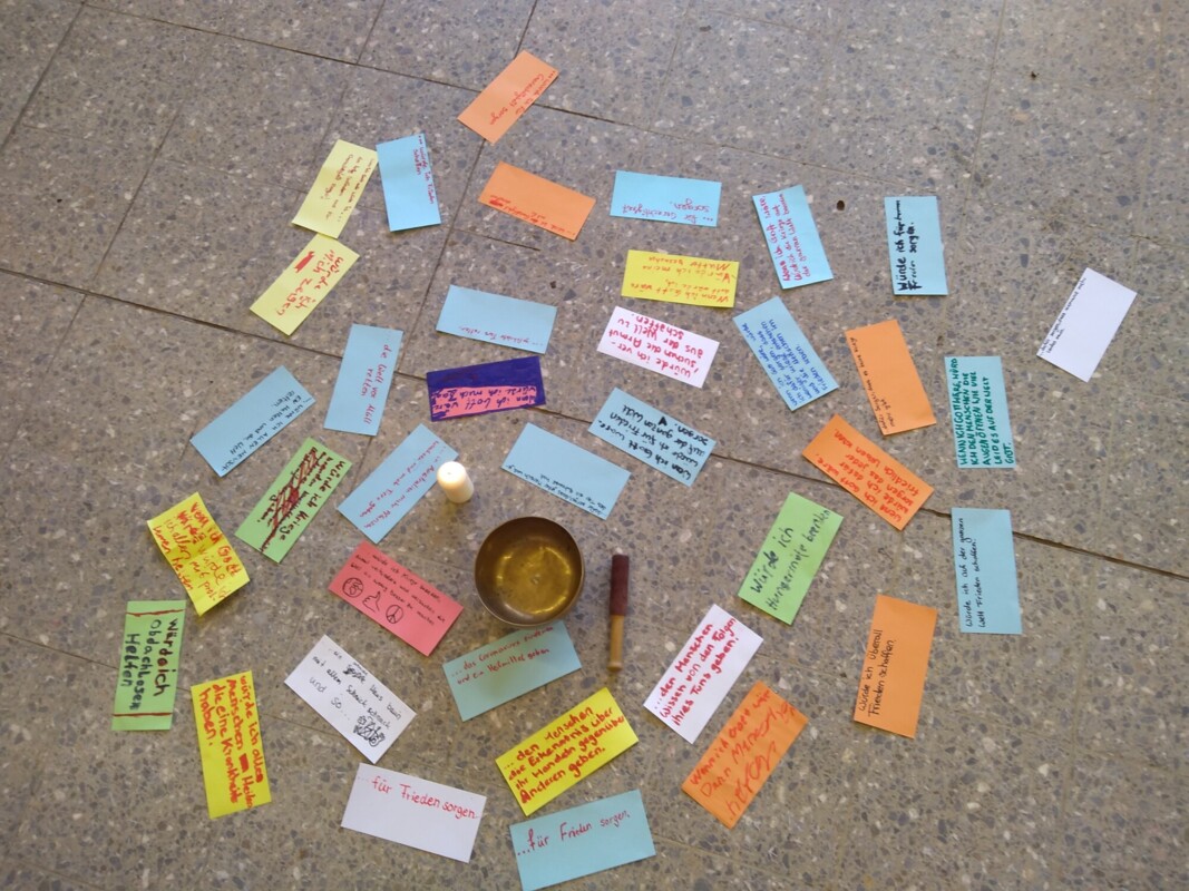 Auf dem gefliesten Fuß-Boden liegen rund um eine Kerze und eine Klangschale viele beschriftete Karteikarten. Konfirmanden haben ihre Wünsche für Frieden und Gerechtigkeit aufgeschrieben.