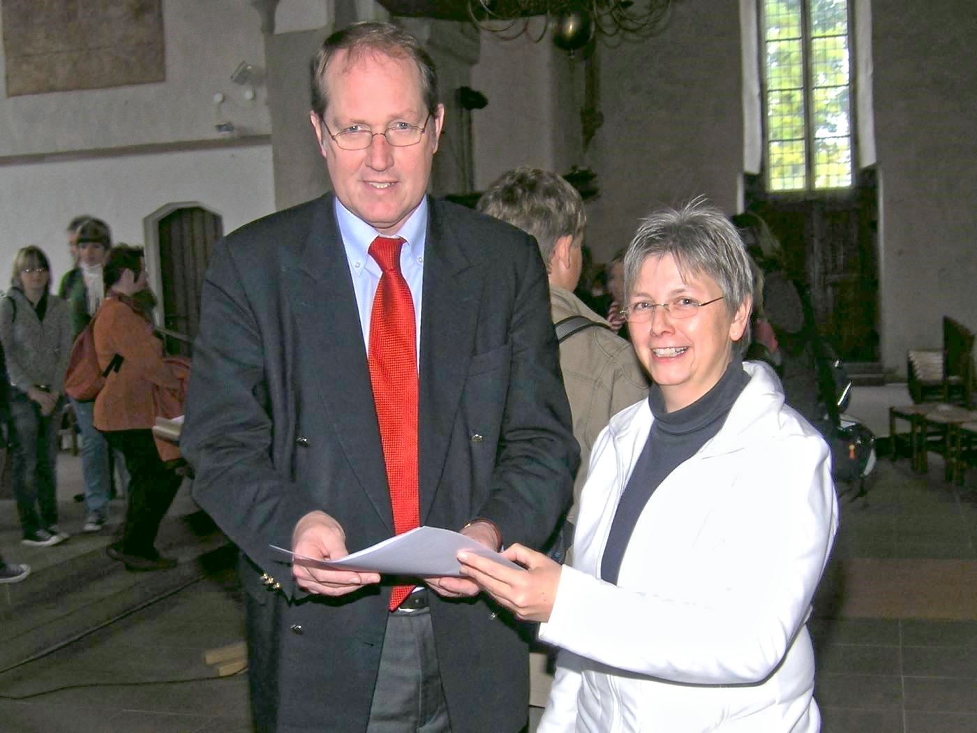 Pfarrerin Dorothea Brand überreichte Kirchenrat Andreas-Christian Tübler in der Dorfkirche Heiden den an die Kirchenvorstände gerichteten „Offenen Brief“.