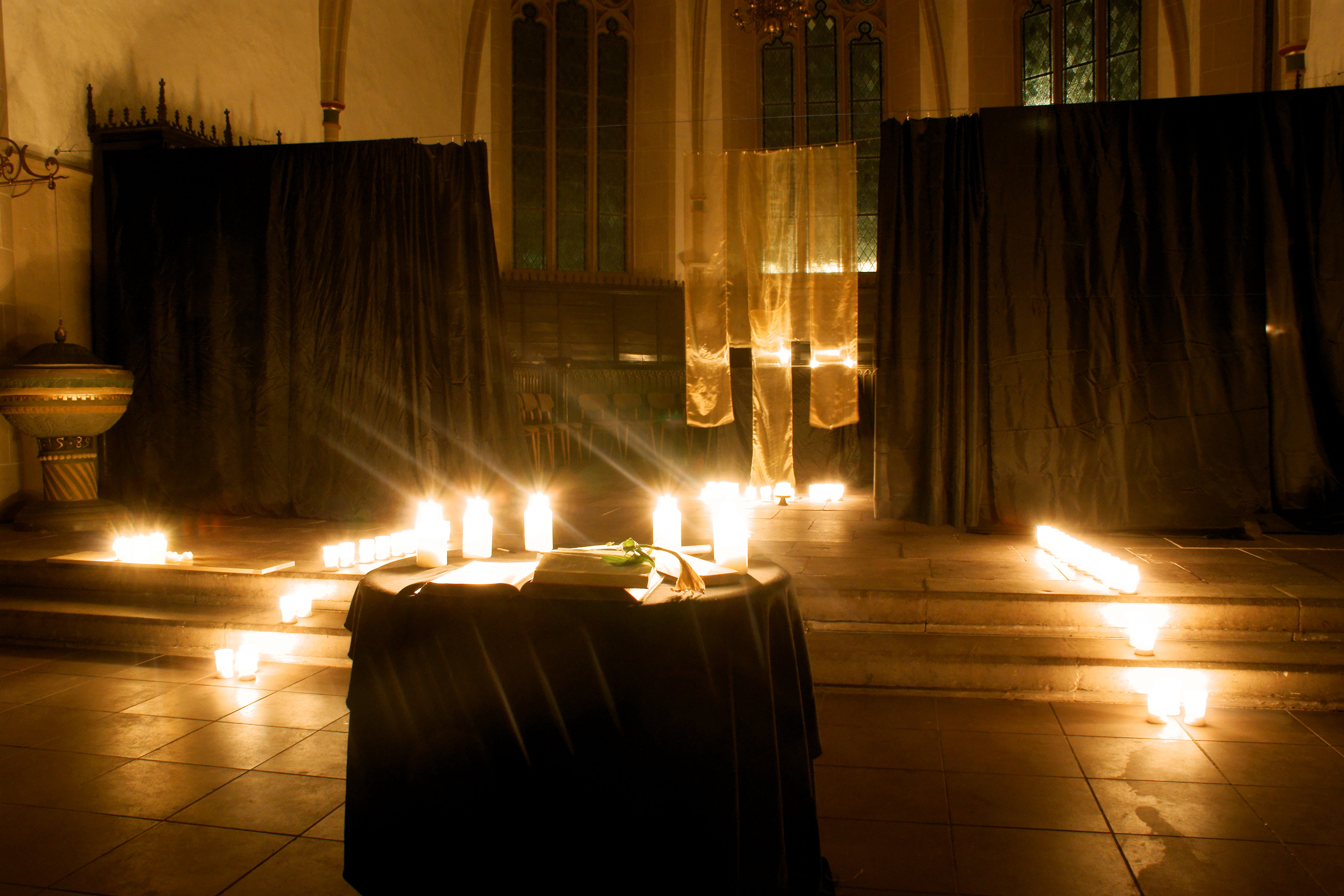 Als erlösende Befreiung aus der beklemmenden Dunkelheit war der zweite Gottesdienstteil zu verstehen. „Dieser Weg führt uns vom Schweigen zum Sprechen, von der Schwere zur Leichtigkeit, vom Tod in die Ewigkeit“, erklärte Pfarrer Fleck. Der schwarze Vorhang wurde beiseite gezogen und gab den Blick frei auf golden schimmernde Organza-Bahnen, die sich in der von den Kerzenflammen erwärmten Luft sanft bewegten. Die Gottesdienstbesucher durchschritten den Vorhang zusammen mit dem Pfarrer und folgten ihm auf einem kerzenflankierten Weg in den Chorraum, um hier biblische Texte zu hören, die das Licht und die Freude darüber zum Gegenstand hatten: die Schöpfungsgeschichte und Teile aus dem „Prediger Salomo“ („Ein jegliches hat seine Zeit …“)