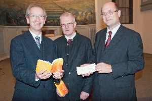 Pfarrer Burkhard Krebber (stv. Vorsitzender der Lippischen Bibelgesellschaft), Professor Christoph Levin und Landessuperintendent Dr. Martin Dutzmann (Vorsitzender der Bibelgesellschaft, von links) mit der 281. Ausgabe (2011) und einem Nachdruck der 1. Ausgabe (1731) der Herrnhuter Losungen.
