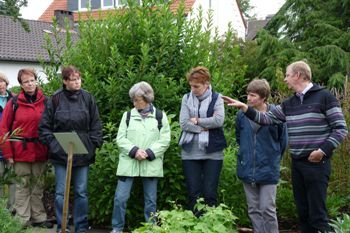 Maik Fleck, Pfarrer der evangelisch-reformierten Kirchengemeinde Horn, führte interessierte Pilger anlässlich der Eröffnung des Pilgerwegs durch den Bibelgarten der Gemeinde.
