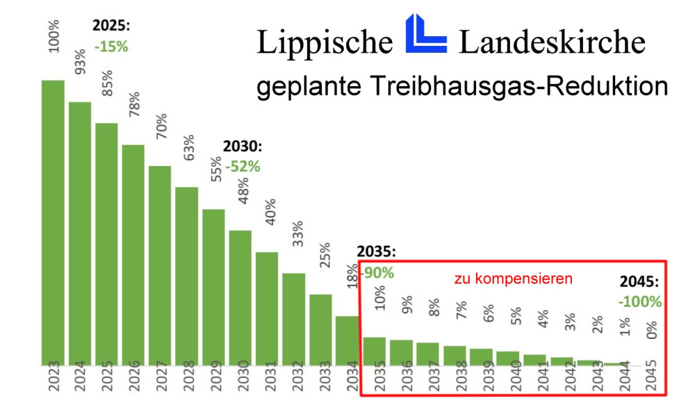Am 22. November 2022 verabschiedete die Synode der Lippischen Landeskirche ein Klimaschutzgesetz und weitere begleitende Beschlüsse mit einem gegenüber dem Klimaschutzkonzept deutlich ehrgeizigeren Ziel. Darin ist eine Reduzierung der Treibhausgasemissionen bis 2035 um 90 Prozent als Ziel vorgegeben. Bis 2045 soll eine reale - nicht nur rechnerische - Klimaneutralität erreicht sein. Das Gesetz nimmt die Eckpunkte einer entsprechenden EKD-Richtlinie auf.