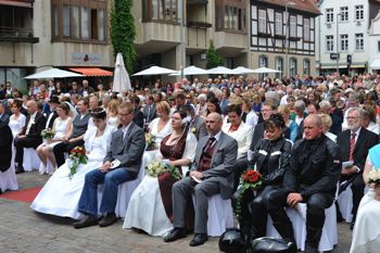 Lemgo. Als die Hochzeitsglocken am Donnerstag, 7. Juni, zum deutschlandweit „1. Ökumenischen Trau-Fest“ auf den Lemgoer Marktplatz riefen, war die Aufmerksamkeit groß, die den 26 teilnehmenden Paaren entgegengebracht wurde. Bestes Wetter und ein umfangreiches Programm trugen zum einmaligen Erlebnis bei.