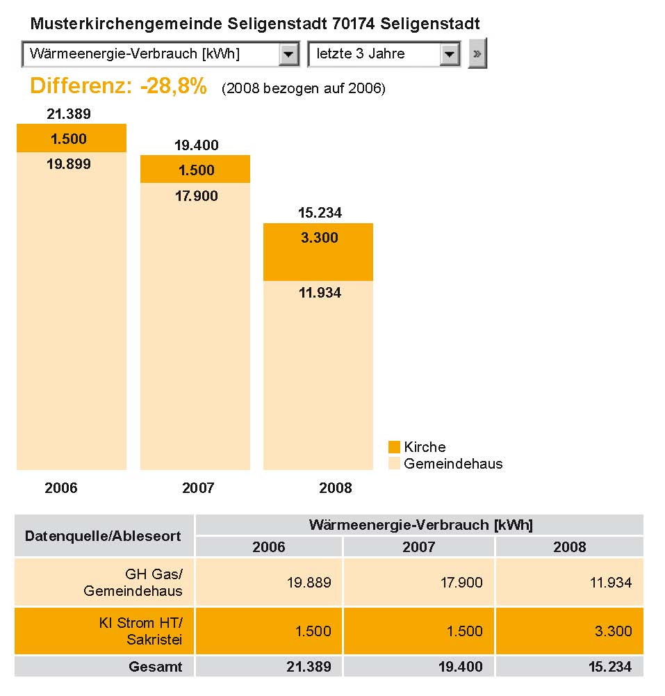 Wenn die Energiedaten monatlich eingetragen werden, werden die Daten übersichtlich dargestellt. In der Monatsansicht wird auf einen Blick sichtbar, wenn der Verbrauch plötzlich ansteigt. Mit der Jahresübersicht kann die Kirchengemeinde sich messbare Ziele setzen, z.B.: »Wir wollen unseren Wärmeverbrauch in den nächsten 3 Jahren um 30% senken.