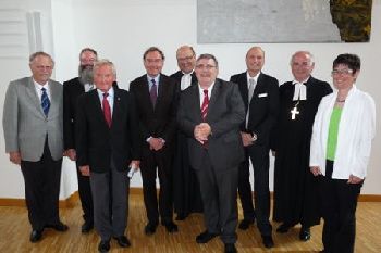 Zum Thema "40 Jahre Leuenberger Konkordie" konnten die Mitglieder des Landeskirchenrates auf der Landessynode Dr. Gerrit Noltensmeier, Landessuperintendent i.R. (3.v.l.), und Landesbischof Dr. Friedrich Weber (Braunschweig), Präsident der Gemeinschaft Evangelischer Kirchen in Europa (2.v.r.), begrüßen.