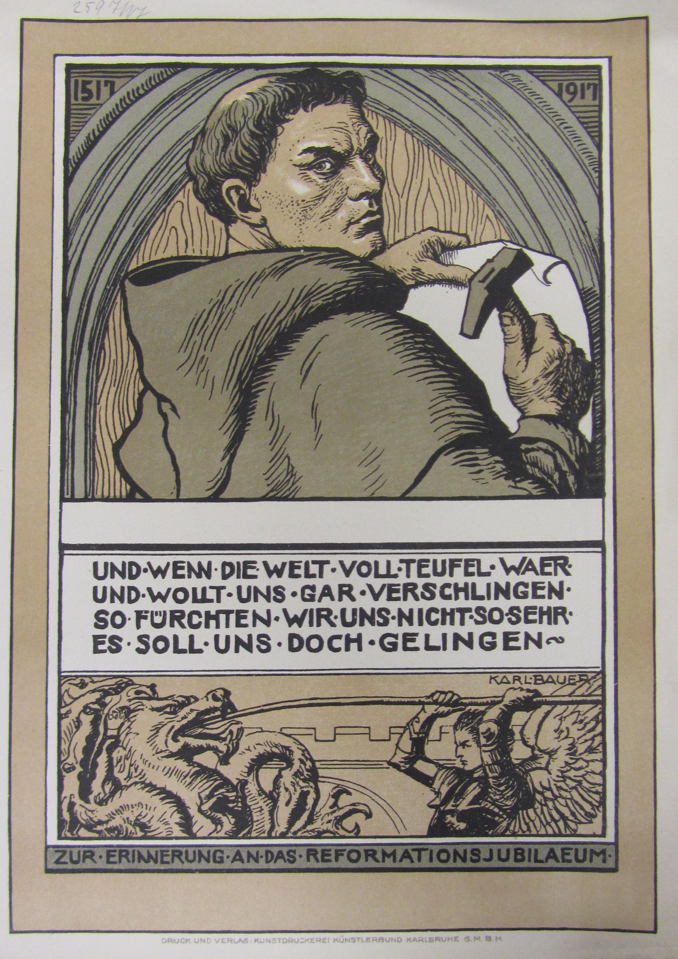 Einladungsblatt zu einem Gottesdienst zum Reformationsjubiläum 1917. Unter Martin Luther beim Anschlag der Thesen ist eine Textzeile aus dem Lied „Ein feste Burg ist unser Gott“ abgedruckt. Bildnachweis: Archiv der Lippischen Landeskirche.