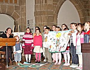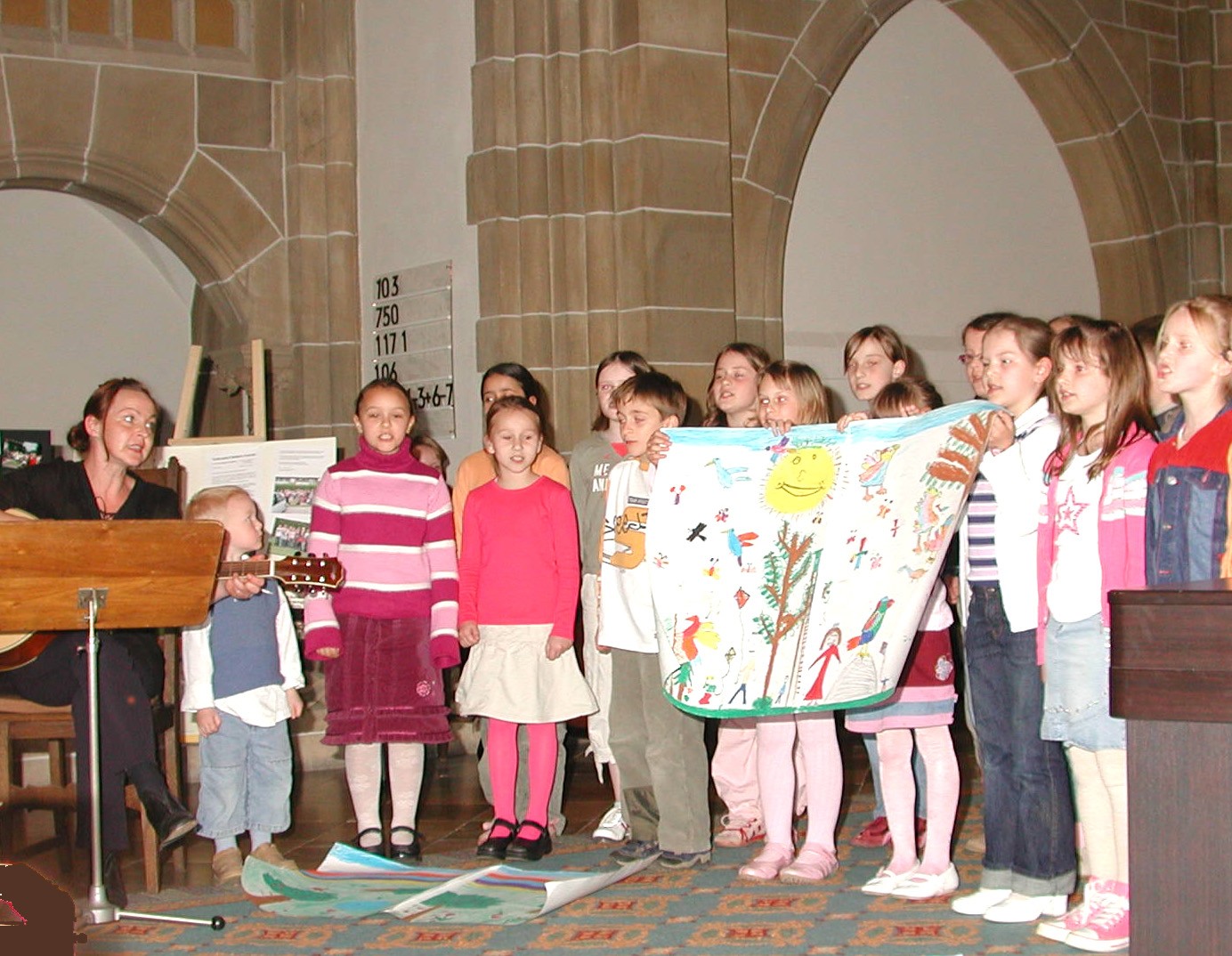 Die Kinder der Grundschule Lage-Billinghausen sangen unter der Leitung von Sonja Weidhase. Sie hatten außerdem große Plakate mitgebracht, die Bilder von der heilen Natur des Paradieses zeigten, wie man sie auch in Tschernobyl gerne hätte. Das Lied „Für die Kinder von Tschernobyl“ wurde gemeinsam mit den Gästen aus Mosyr gesungen. Es bildete eine Brücke zwischen den deutschen Kindern und den Gästen der Schule 13 in Mosyr, die für ihre Liedvorträge unter der Leitung von Jewa A. Bobr viel Beifall bekamen.