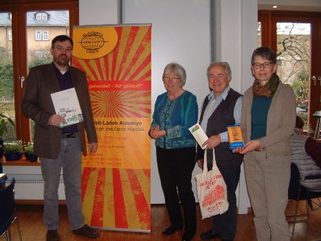 Emmie Rakowsky vom Eine-Welt-Laden Alavanyo machte deutlich, dass für alle Waren im Fairen Handel gerechte Entlohnung, Nachhaltigkeit und Transparenz in der gesamten Produktionskette gelten. Sie ermutigte die Teilnehmer aus den Kirchengemeinden, beim Einkauf auf diese Kriterien zu achten und bei Veranstaltungen Kaffee, Tee und Orangensaft aus fairem Handel auszuschenken.