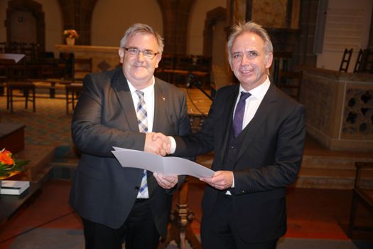 Ernennung zum Kirchenmusikdirektor: Landeskantor Burkhard Geweke (rechts) erhält in der Christuskirche Detmold die Urkunde zur Ernennung durch Kirchenrat Tobias Treseler.