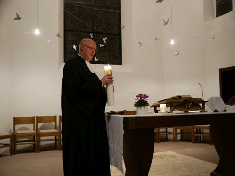 Superintendent Hauptmeier goss während der Predigt etwas Kerzenwachs der schwach glimmenden Wanderfriedenskerze ab und brachte sie so zum Leuchten: „Wie überflüssiges Kerzenwachs Flammen erstickt, nehmen Mauern und Grenzen Lebensfreude. Festgefahrene Strukturen sind hohe Mauern, die Menschen gefangen halten.“ Jesus habe einen Aussätzigen geheilt, indem er ihn berührte. (Mk.1,40 ff.). Wir verhielten uns oft zu Menschen, als hätten sie Aussatz und grenzen sie aus: „Jede Klasse oder Gruppe kennt Außenseiter. Konflikte trennen Menschen, die dann kein Wort mehr wechseln. Jesus sprengt diese Grenzen, er geht zu denen, die andere meiden.“