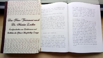 Aber könnte man Schüler und Schülerinnen begeistern, die Arbeit, die sich Luther mit der handschriftlichen Übersetzung des Neuen Testamentes im September 1522, also vor genau 485 Jahren gemacht hat, nachzuempfinden, indem sie selbst einen kleinen Teil dieses Neuen Testamentes abschreiben, damit daraus ein großes Ganzes, nämlich unsere 'Schulbibel' wird? „Das wird 'unsere' Bibel“, so die einhellige Meinung vieler Schülerinnen und Schüler. Ein alter Text zwar, aber durch die individuellen Schriften so vieler Schüler mit ganz neuem Leben gefüllt.
