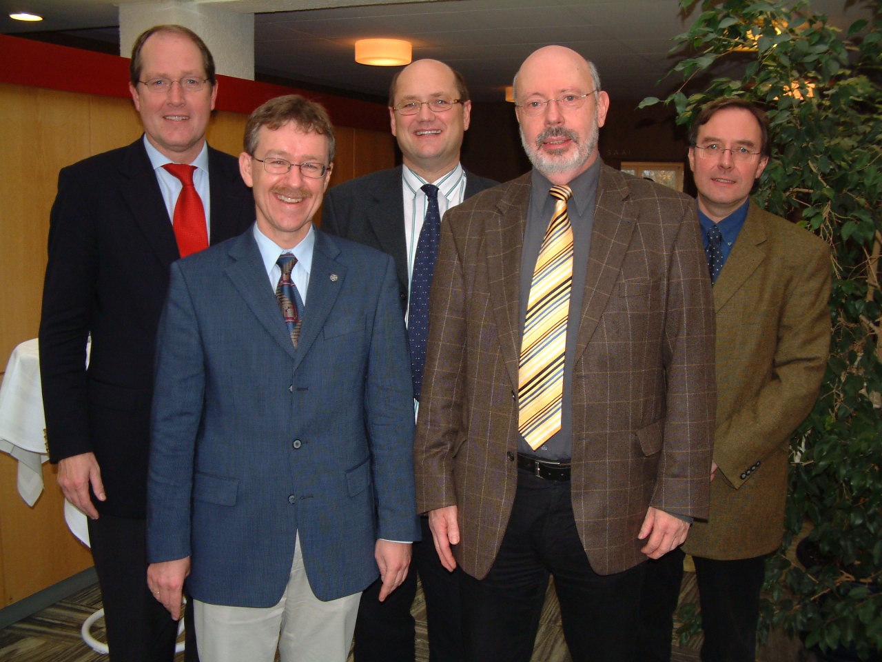 : Kirchenrat Andreas-Christian Tübler, Landessuperintendent Dr. Martin Dutzmann und Kirchenrat Dr. Arno Schilberg (hintere Reihe von links) konnten auf dem Tag der Kirchenvorstände Oberkirchenrat Prof. Dr. Klaus Grünwald von der VELKD und Pfarrer Jörg Schmidt vom Reformierten Bund (von links) begrüßen.