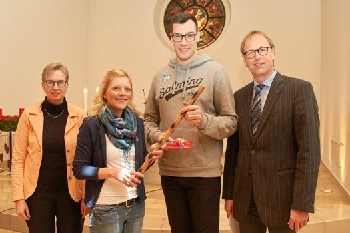 Flankiert von Sabine Hartmann (links) und Dieter Bökemeier (rechts) überreichte Ina Carl dem Handball-Profi Isaias Guardiola den Staffelstab.
