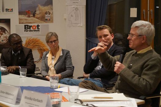 Deutliche Kritik, zumindest an den staatlichen Formen internationaler Entwicklungshilfe, kam von Kurt Gerhardt. Diese hätten zu Abhängigkeit, Lähmung und einer Bettlermentalität geführt, betonte er. Der Journalist ist Mitinitiator des „Bonner Aufrufs“, der 2008 radikale Veränderungen und in einer zehn Jahre später folgenden Erklärung das Ende der bisherigen Entwicklungshilfe forderte. Maßstab ist für Gerhardt das Subsidiaritätsprinzip, wonach der Starke dem Schwachen nur in dem Maße helfe, wie er es brauche: „Die Entwicklungshilfe verletzt dieses Prinzip und missachtet die Würde und Eigenverantwortung der Menschen in Afrika.“ Gerhardts Forderung, die afrikanischen Länder sollten sich selbstständig entwickeln, stieß auf dem Podium auf wenig Zustimmung. Einig waren sich die Beteiligten dagegen, dass die Gelder in der Vergangenheit nicht immer sinnvoll eingesetzt worden seien. Unisono forderten sie einen verantwortungsvollen Umgang mit den vorhandenen Ressourcen, der berücksichtigt, was der Partner tatsächlich braucht. Das Saxophonquartett „AbraxSax“ hatte den Abend musikalisch begleitet.