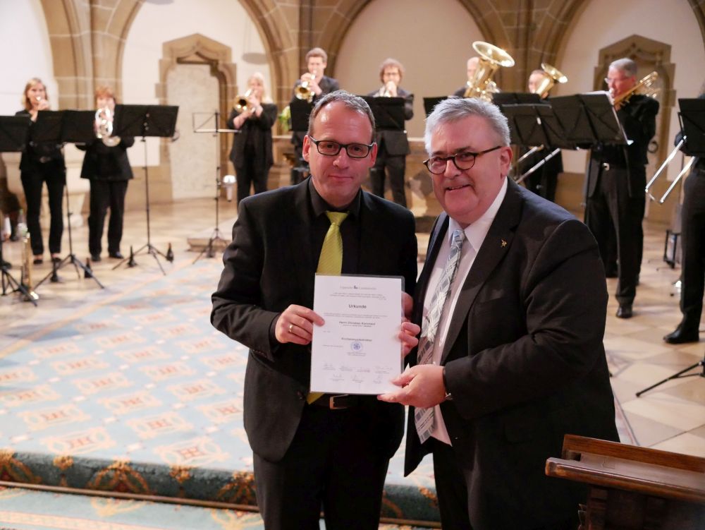 Kreis Lippe/Detmold. Im Rahmen eines Konzertes in der Christuskirche wurde Landesposaunenwart Christian Kornmaul der Titel „Kirchenmusikdirektor“ (KMD) durch Kirchenrat Tobias Treseler verliehen (v.l.). Die Lippische Landeskirche zeichnet damit hauptamtliche Kirchenmusiker für langjährige herausragende und überregionale Tätigkeiten im Dienst der Kirchenmusik aus.