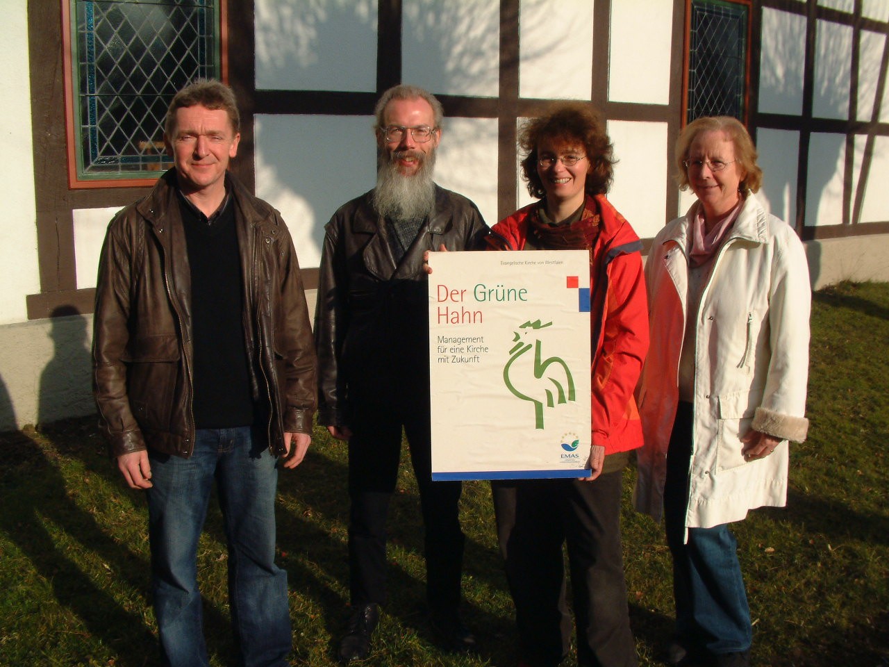 In Bergkirchen kräht seit einem Jahr der Grüne Hahn: das Umweltteam der evangelisch-lutherischen Kirchengemeinde Bergkirchen – Martin Frickmeier, Peter Homburg, Cornelia Wentz und Heidi Neumeyer (von links) – achtet im Alltag und bei Baumaßnahmen auf ökologische Aspekte. Das wurde jetzt mit dem europäischen Umweltsiegel EMAS belohnt.