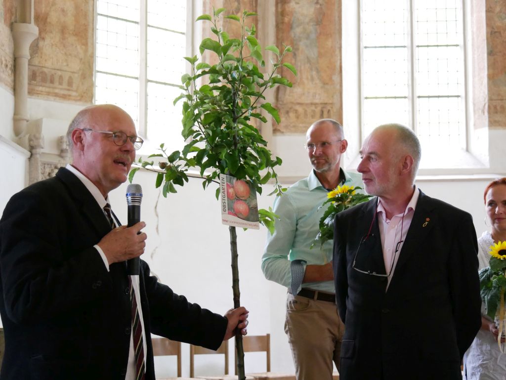 Adolf Meier zu Dölderdissen wurde am Ende des Bauerntages verabschiedet. Seit 1976 engagiert er sich in der Landeskirche, seit zehn Jahren als Vorsitzender der Kammer für den ländlichen Raum. Dirk Hauptmeier, Beauftragter der Lippischen Landeskirche für den ländlichen Raum, bedankte sich bei ihm für seine langjährigen Verdienste mit einem Apfelbaum, den er freudig als Zeichen der Nachhaltigkeit mit dem Lutherzitat einpflanzen möchte: „Wenn ich wüsste, dass morgen die Welt unterginge, würde ich heute noch ein Apfelbäumchen pflanzen.“