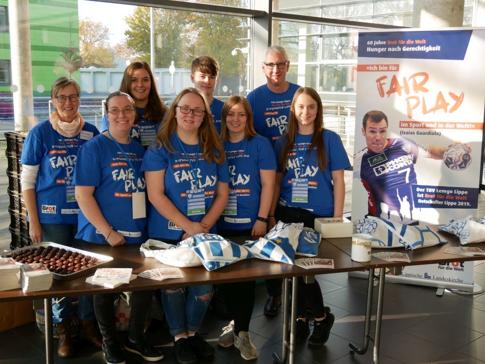 Engagiert für „Brot für die Welt“ beim TBV-Spiel. Mit Sabine Hartmann, Pauline Beckmann, Laura Greff, Svenja Ollenburg, Luca Dahmer, Saskia Bruns, André Stitz und Yvonne Bruns (von links).