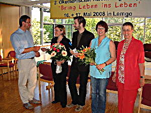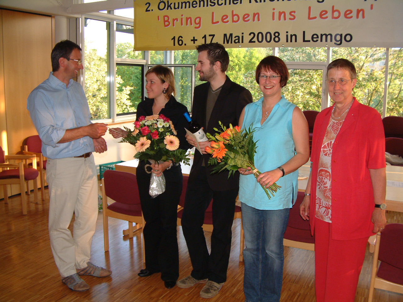 Mareike Ottrand und Sebastian Mittag haben sich mit ihrer Gestaltung das Preisgeld von 1.200 Euro mehr als verdient, da ist sich das Präsidium des Ökumenischen Kirchentages 2008 in Lippe einig. Der Abreißkalender soll Menschen in Lippe durch das Jahr 2008 begleiten, das Jahr des 2. Ökumenischen Kirchentages, der am 16. Und 17. Mai in Lemgo stattfinden wird. Die beiden Studierenden haben eine überzeugend einfache und dennoch originelle Gestaltung vorgelegt. Ein roter Faden führt durch den Kalender, von Blatt zu Blatt, an besonderen Tagen besonders geformt, als Stern zum Beispiel an Heiligabend, als Herz am Valentinstag oder als Knoten am 3. Oktober, dem Tag der Deutschen Einheit. Kleine Andachten und Gedanken von Menschen in Lippe geben dazu einen Impuls für jeden Tag.