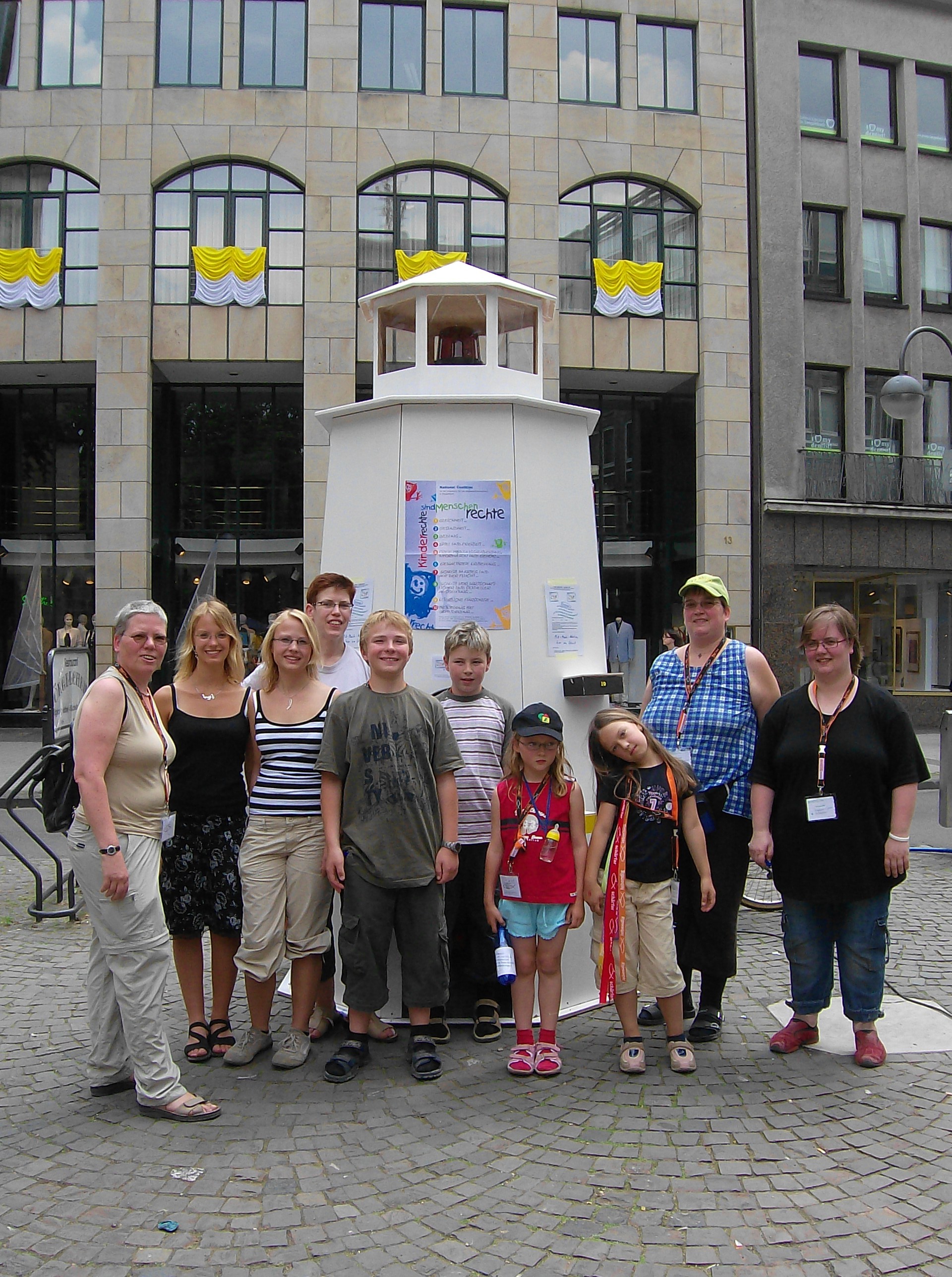 Intensiv hatte sich das Kirchentags-Team aus Lippe unter der Leitung von Doris Riffelmann, landeskirchliche Referentin für die Arbeit mit Kindern, mit dem Thema Kinderrechte auseinandergesetzt. Denn auch in der Kirche ist es wichtig, die UN- Kinderrechtskonvention kennen zu lernen und mitzuhelfen sie umzusetzen. In der Bibel heißt es, dass Jesus die Kinder in die Mitte nahm. Und „Kinder mittendrin“, die Aussage der Lippischen Landessynode, bleibt zu verwirklichen. Ein Schritt in diese Richtung ist es, Kinderrechte bekannt zu machen. Angesichts der aktuellen „Leuchtfeuer“- Diskussion in allen evangelischen Kirchen in Deutschland ist klar, ein Leuchtturm passt gut dazu. So entstand in Lippe die Projektidee, einen Kinderrechte -Leuchtturm zu bauen, in dem die 54 Kinderechte vorgestellt werden. Begleitend dazu gab es beim „Zentrum Kinder“ vom 6. – 10. Juni auf dem Kirchentag in Köln eine Flaschenpost-Aktion. Hier konnten Kinder, Jugendliche und Erwachsene ihr wichtigstes Kinderrecht benennen und dazu ein paar Zeilen schreiben oder ein Bild malen, dass über die „Kinderbootschaft“, ein Projekt der Ev. Jugend aus Berlin, per Flaschenpost weiter geleitet und ins Internet gestellt wird (www.kinderbootschaft.de) .