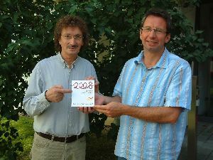 Der Beauftragte der Lippischen Landeskirche für den 2. Ökumenischen Kirchentag, Pfarrer Holger Postma (rechts), und Geschäftsführer Fritz Tibbe präsentieren den Kalender zum Kirchentagsjahr 2008.